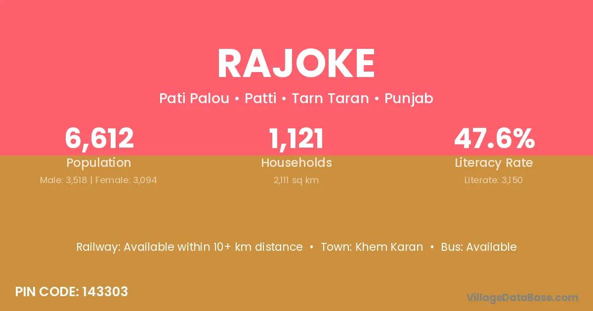 Rajoke village has a total population of 6,612 people, of which 3,518 are males and 3,094 are females.