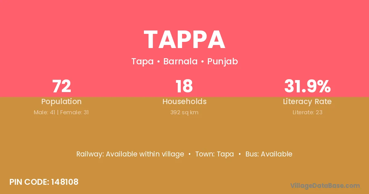 The literacy rate of Tappa village is 62.17%. Male literacy stands at 70.68% and female literacy at 52.27%.
