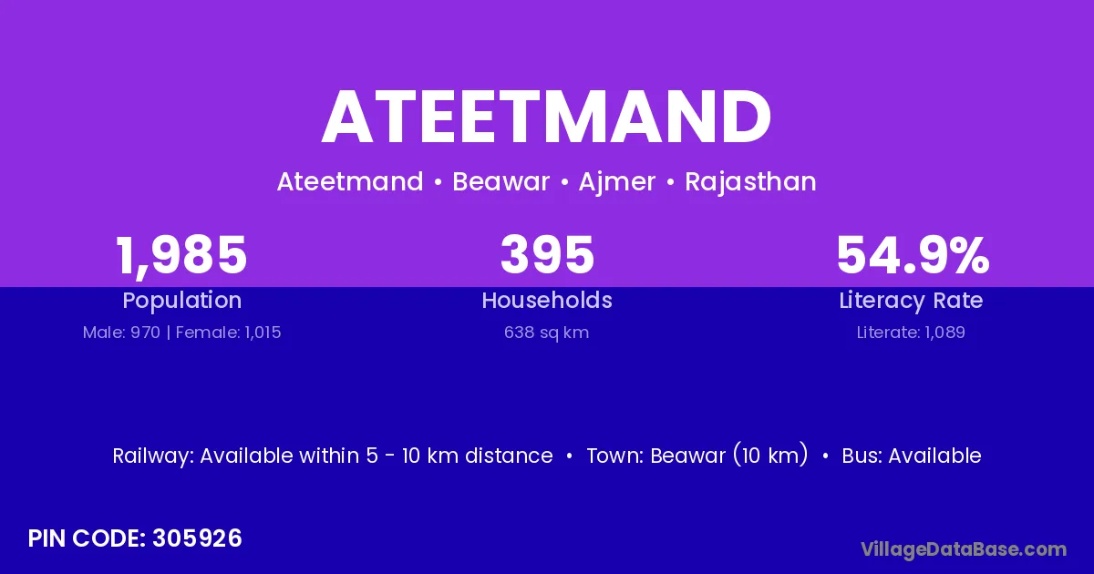 Beawar (10 km) is the nearest town to Ateetmand village for major economic activities and is located approximately 10 km away.