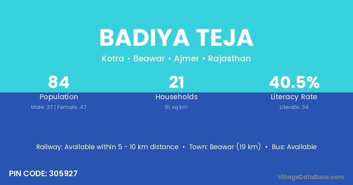 Beawar (19 km) is the nearest town to Badiya Teja village for major economic activities and is located approximately 19 km away.