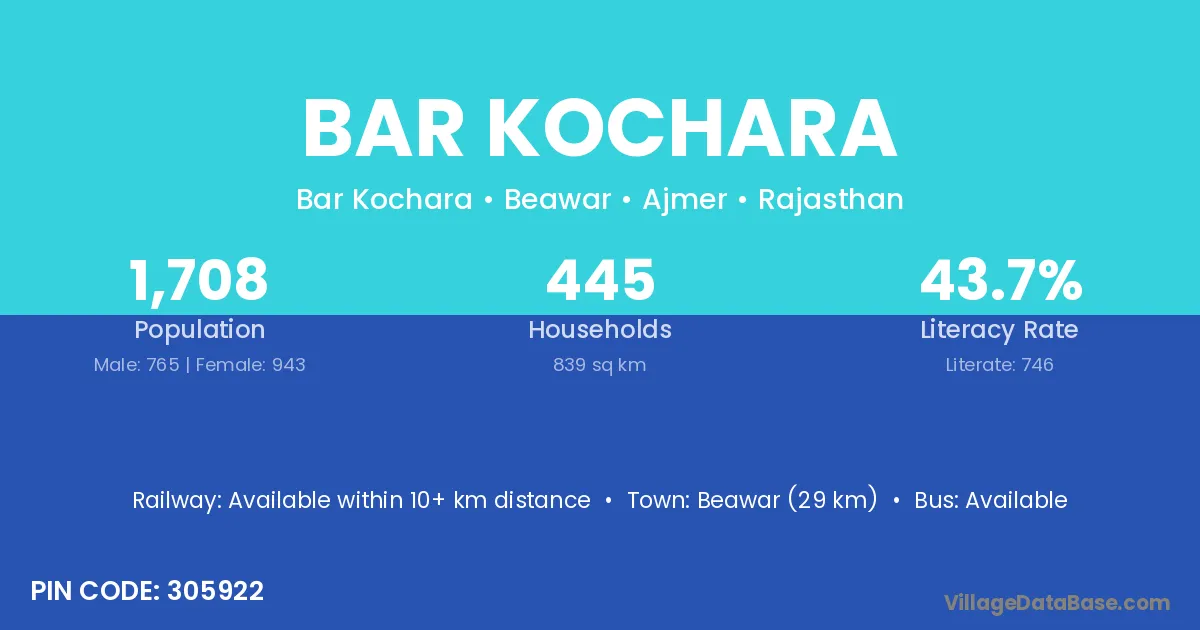 Beawar (29 km) is the nearest town to Bar Kochara village for major economic activities and is located approximately 29 km away.