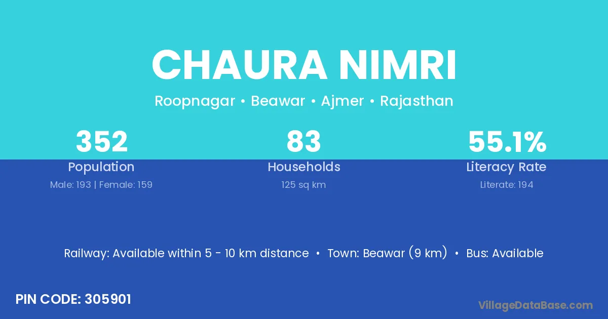 Beawar (9 km) is the nearest town to Chaura Nimri village for major economic activities and is located approximately 9 km away.