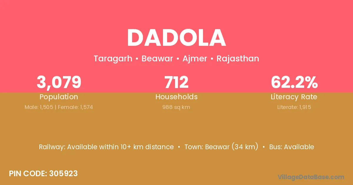 Beawar (34 km) is the nearest town to Dadola village for major economic activities and is located approximately 34 km away.
