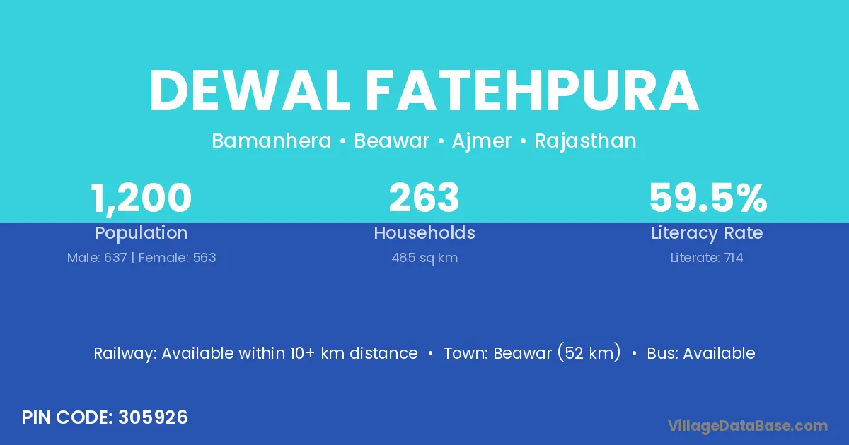 Beawar (52 km) is the nearest town to Dewal Fatehpura village for major economic activities and is located approximately 52 km away.