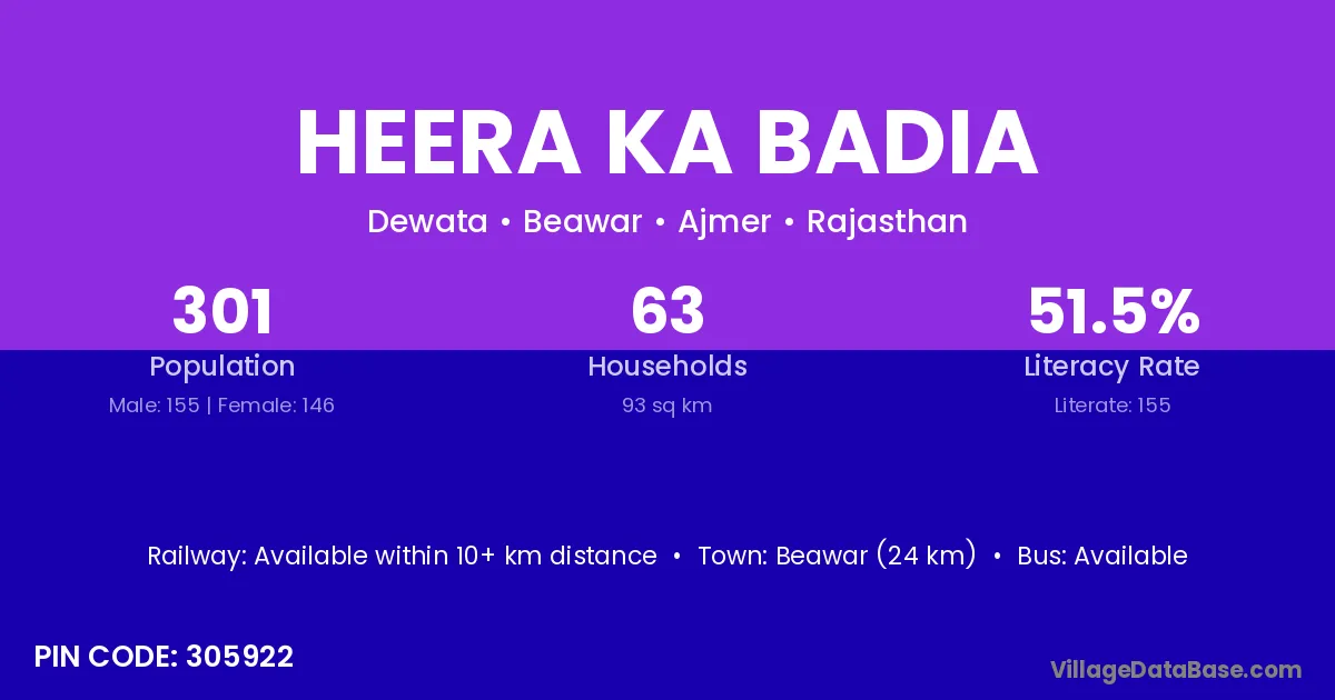 Beawar (24 km) is the nearest town to Heera Ka Badia village for major economic activities and is located approximately 24 km away.
