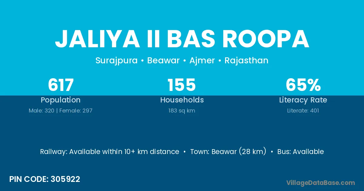 Beawar (28 km) is the nearest town to Jaliya Ii Bas Roopa village for major economic activities and is located approximately 28 km away.