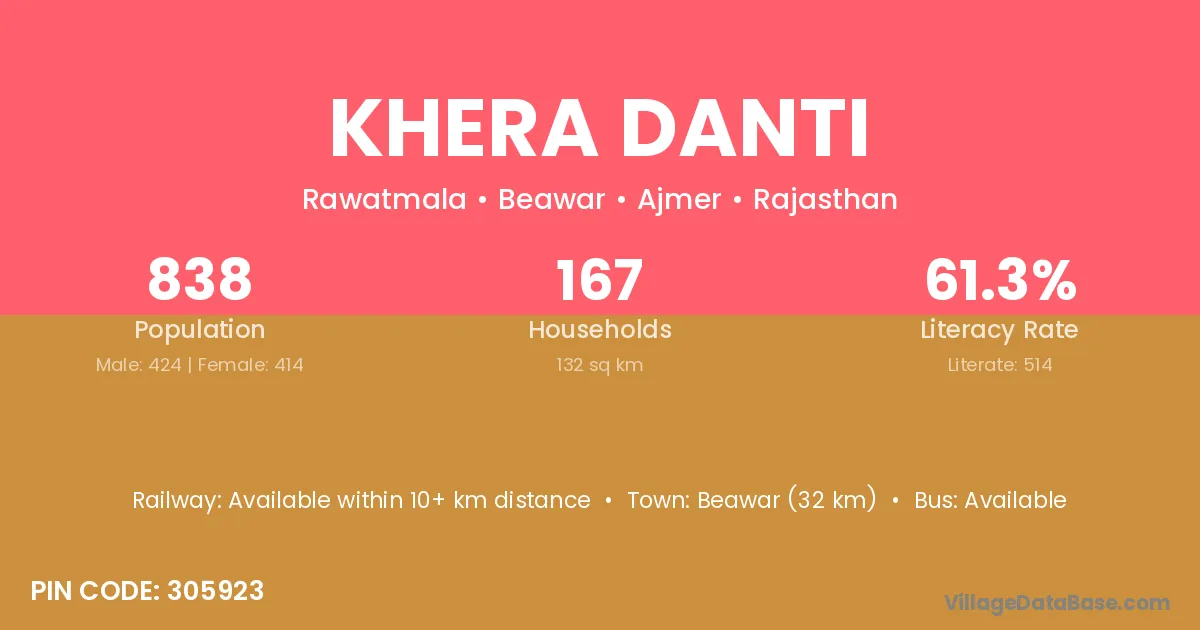 Beawar (32 km) is the nearest town to Khera Danti village for major economic activities and is located approximately 32 km away.