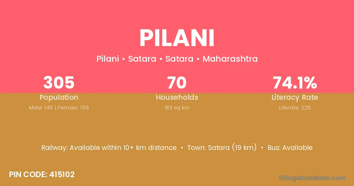 The literacy rate of Pilani village is 44.69%. Male literacy stands at 57.14% and female literacy at 30.84%.