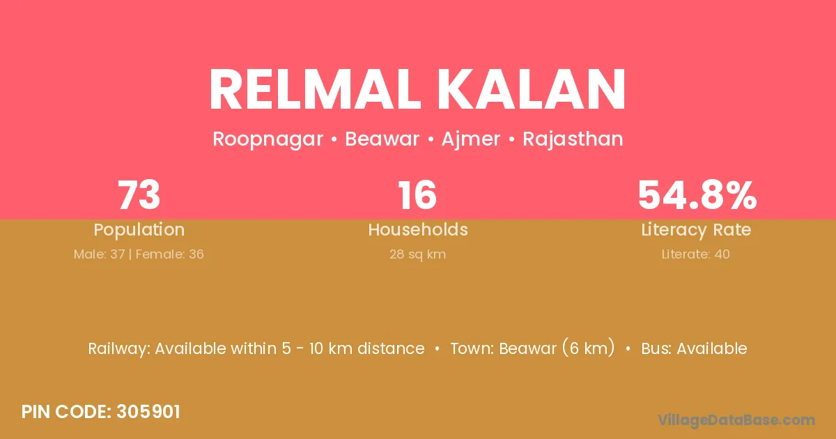 Beawar (6 km) is the nearest town to Relmal Kalan village for major economic activities and is located approximately 6 km away.