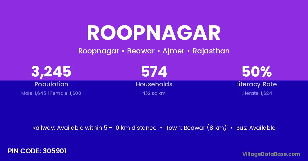 Beawar (8 km) is the nearest town to Roopnagar village for major economic activities and is located approximately 8 km away.