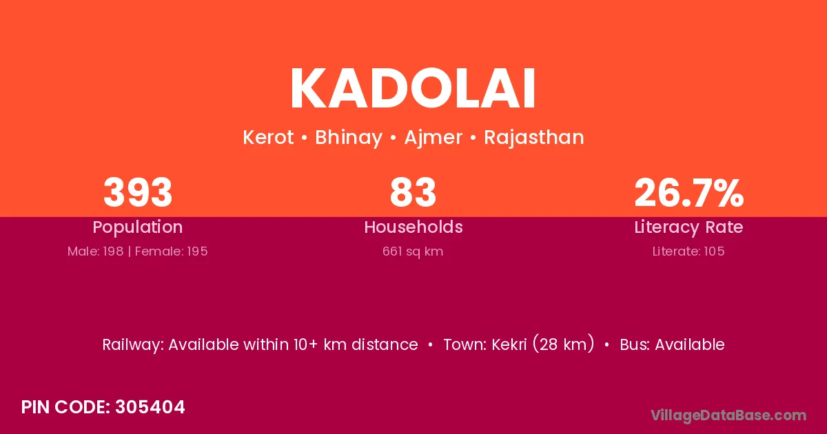 Kekri (28 km) is the nearest town to Kadolai village for major economic activities and is located approximately 28 km away.