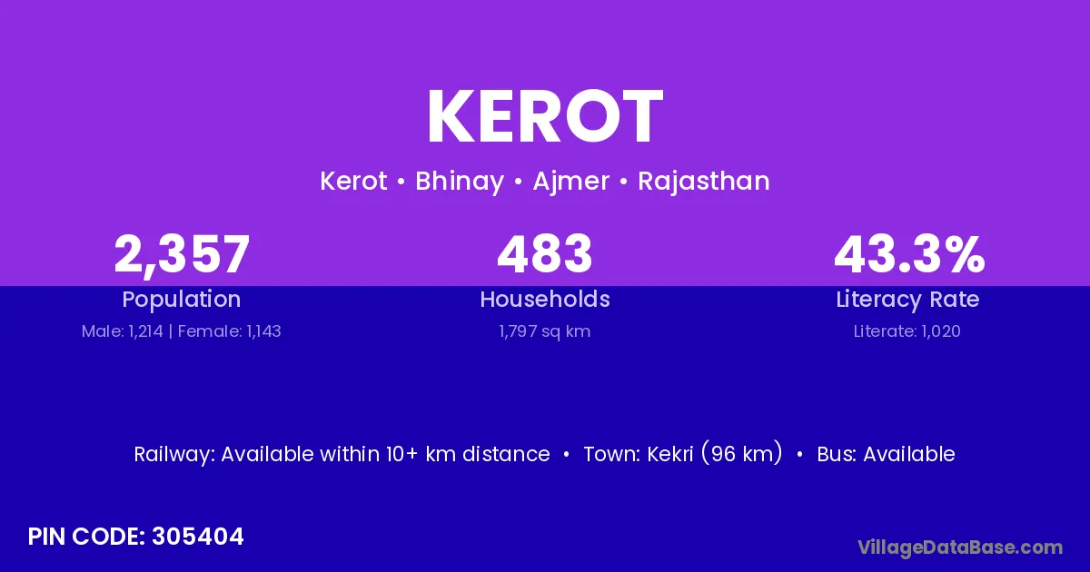 Kekri (96 km) is the nearest town to Kerot village for major economic activities and is located approximately 96 km away.