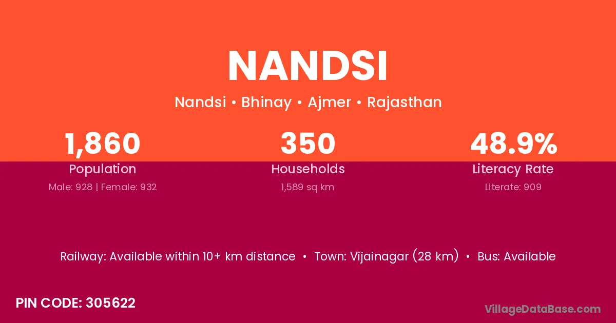 Vijainagar (28 km) is the nearest town to Nandsi village for major economic activities and is located approximately 28 km away.