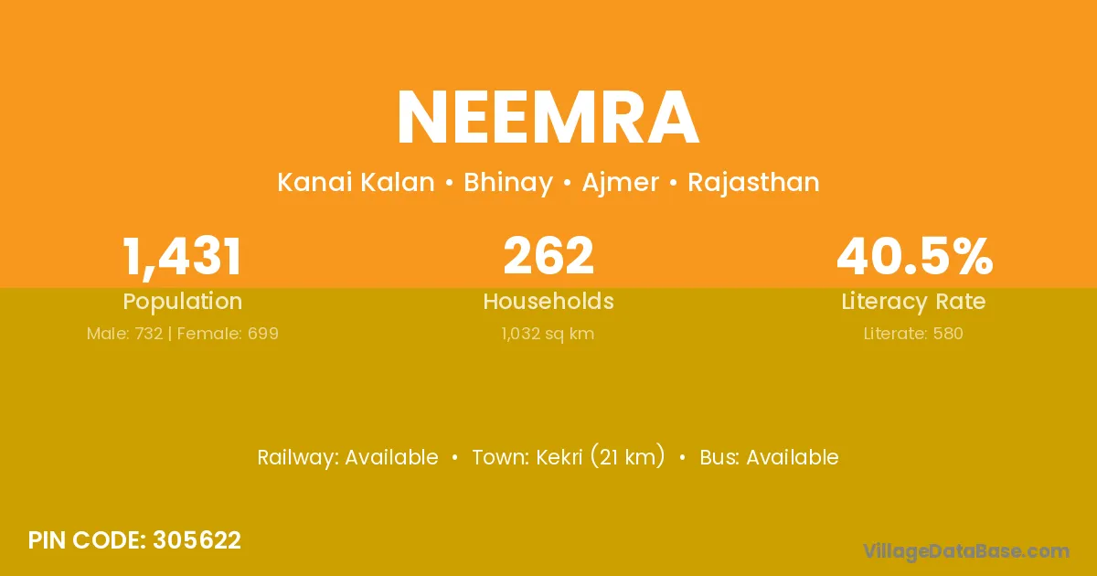 Kekri (21 km) is the nearest town to Neemra village for major economic activities and is located approximately 21 km away.