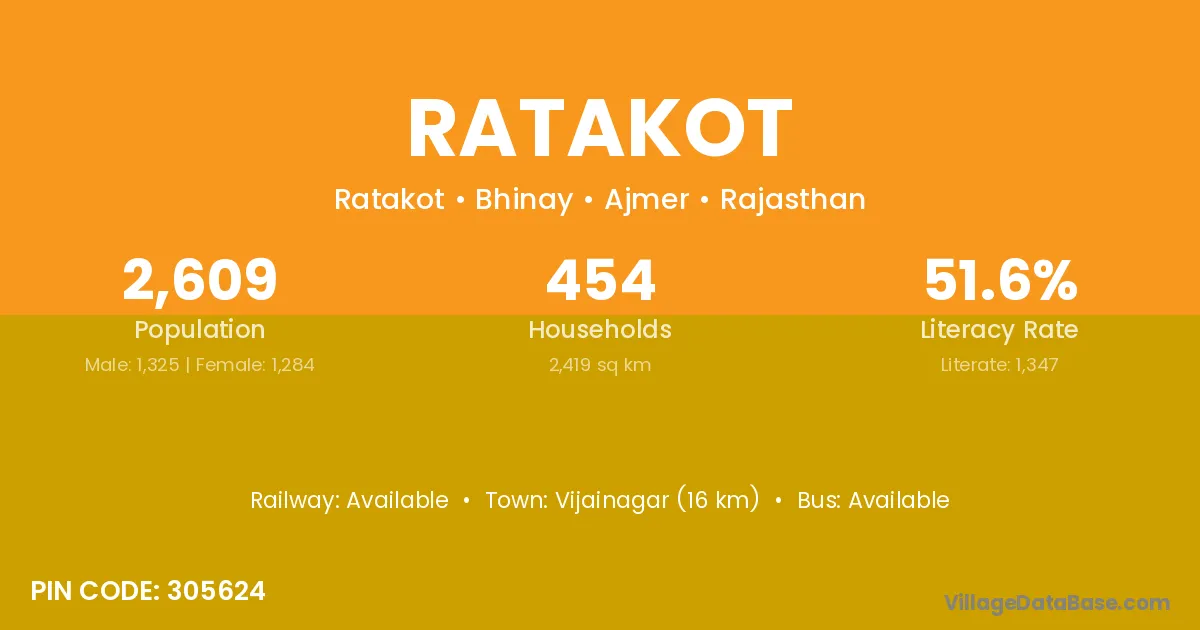 Vijainagar (16 km) is the nearest town to Ratakot village for major economic activities and is located approximately 16 km away.