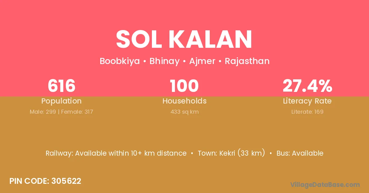 Kekri (33 km) is the nearest town to Sol Kalan village for major economic activities and is located approximately 33 km away.