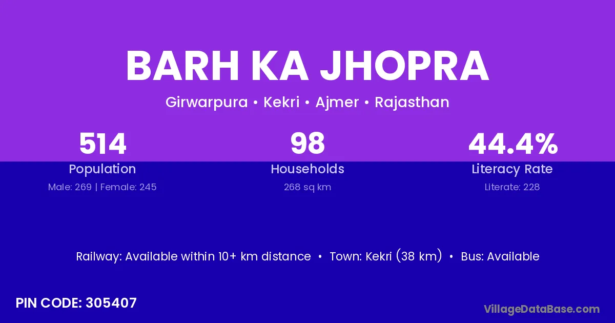 Kekri (38 km) is the nearest town to Barh Ka Jhopra village for major economic activities and is located approximately 38 km away.