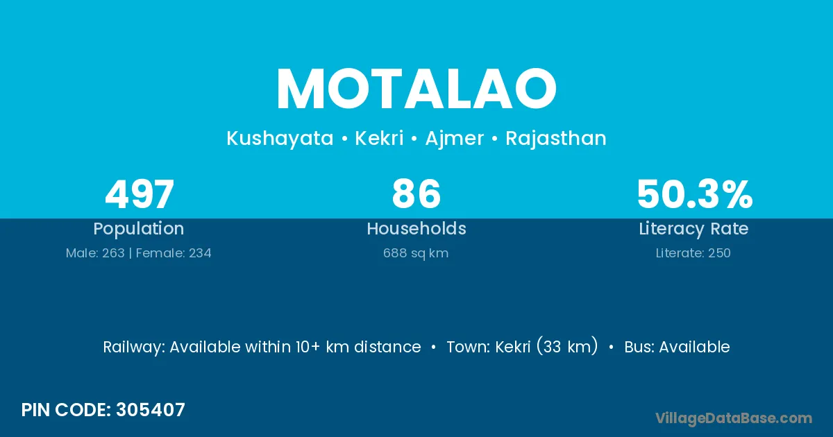 Kekri (33 km) is the nearest town to Motalao village for major economic activities and is located approximately 33 km away.