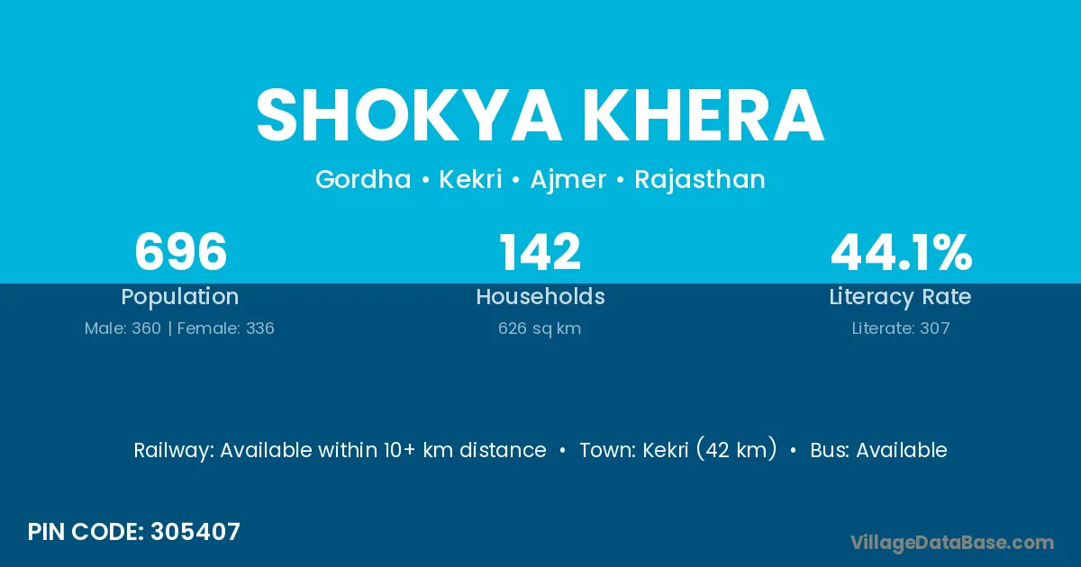 Kekri (42 km) is the nearest town to Shokya Khera village for major economic activities and is located approximately 42 km away.