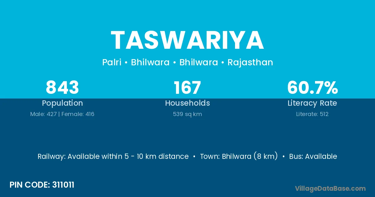 Kekri (14 km) is the nearest town to Taswariya village for major economic activities and is located approximately 14 km away.