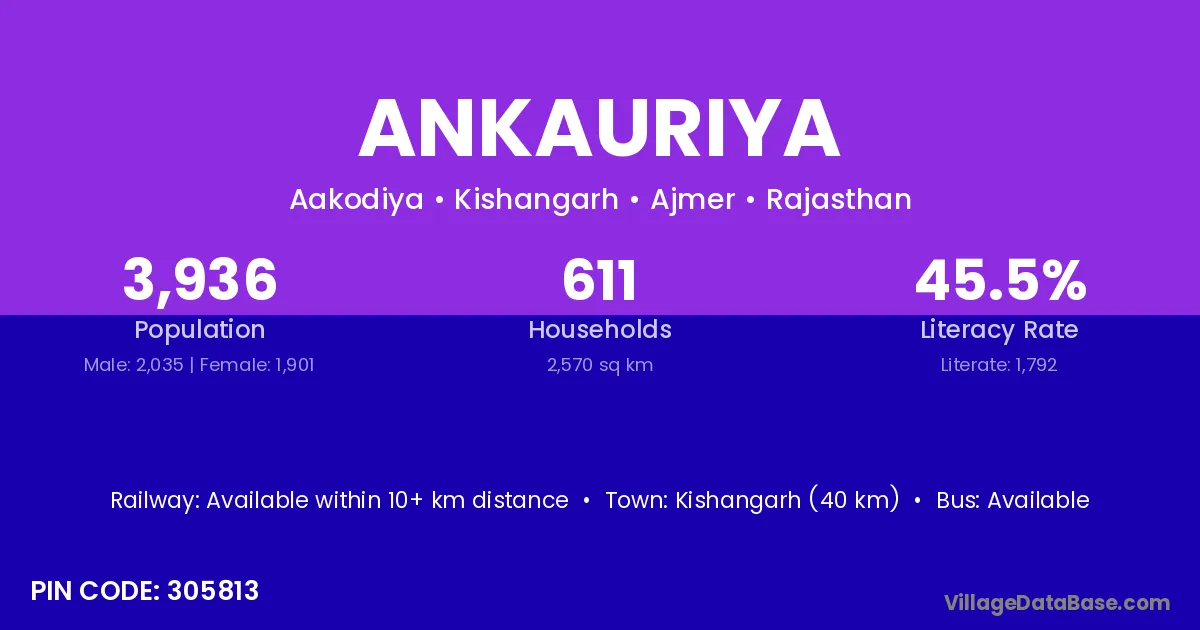 Kishangarh (40 km) is the nearest town to Ankauriya village for major economic activities and is located approximately 40 km away.
