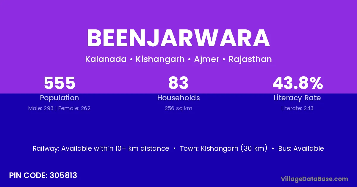 Kishangarh (30 km) is the nearest town to Beenjarwara village for major economic activities and is located approximately 30 km away.
