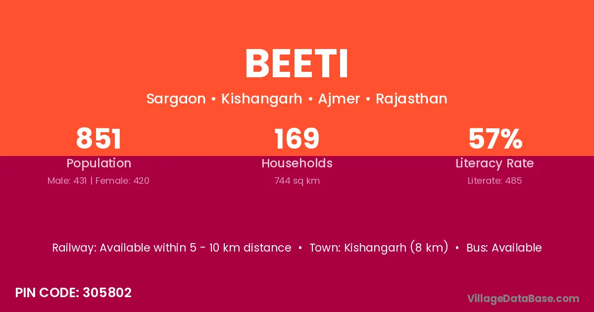 Kishangarh (8 km) is the nearest town to Beeti village for major economic activities and is located approximately 8 km away.