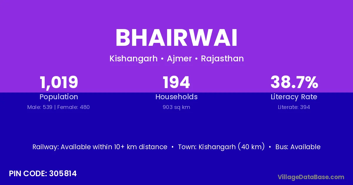 Kishangarh (40 km) is the nearest town to Bhairwai village for major economic activities and is located approximately 40 km away.