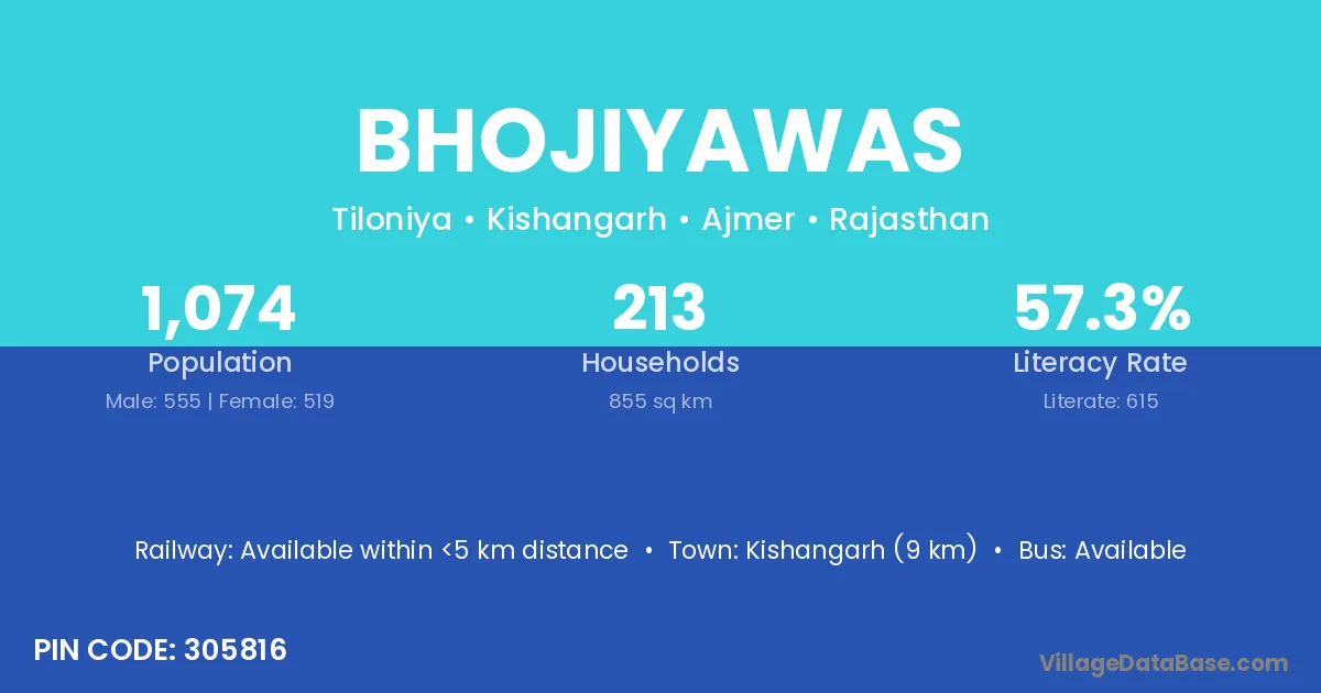 Kishangarh (9 km) is the nearest town to Bhojiyawas village for major economic activities and is located approximately 9 km away.