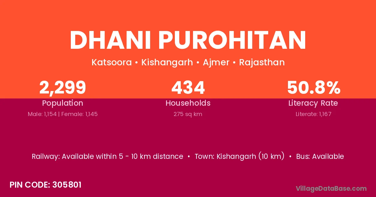 Kishangarh (10 km) is the nearest town to Dhani Purohitan village for major economic activities and is located approximately 10 km away.