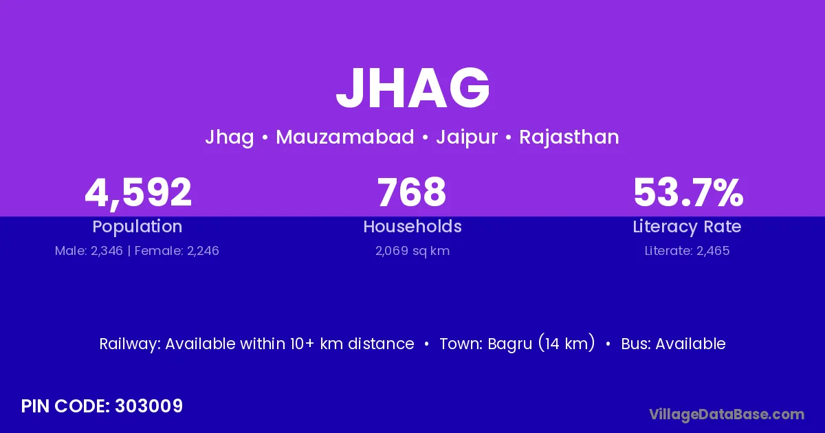 Kishangarh (50 km) is the nearest town to Jhag village for major economic activities and is located approximately 50 km away.