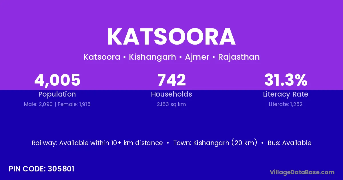 Kishangarh (20 km) is the nearest town to Katsoora village for major economic activities and is located approximately 20 km away.