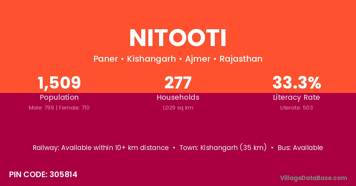 Kishangarh (35 km) is the nearest town to Nitooti village for major economic activities and is located approximately 35 km away.