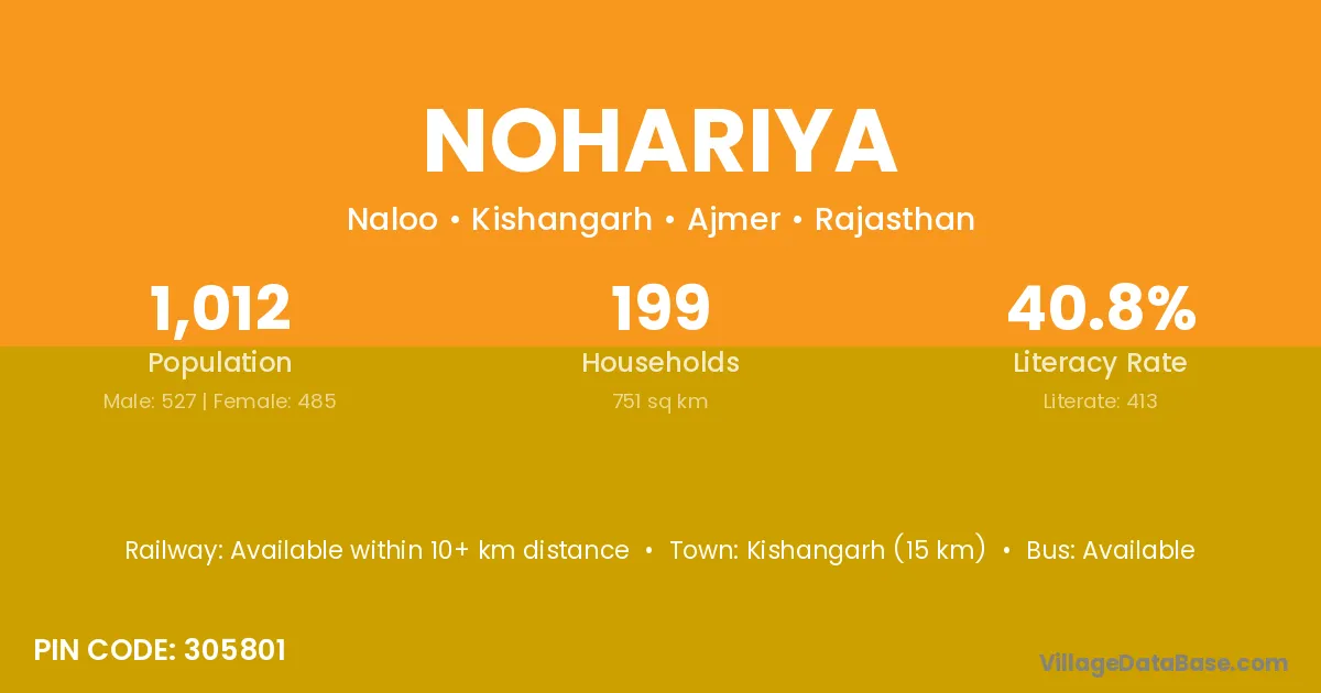 Kishangarh (15 km) is the nearest town to Nohariya village for major economic activities and is located approximately 15 km away.