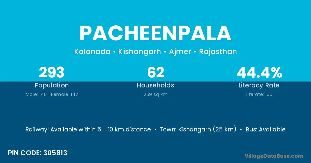 Kishangarh (25 km) is the nearest town to Pacheenpala village for major economic activities and is located approximately 25 km away.