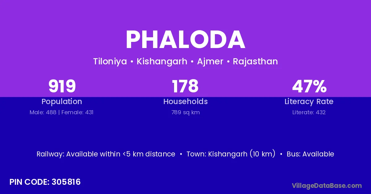 Kishangarh (10 km) is the nearest town to Phaloda village for major economic activities and is located approximately 10 km away.
