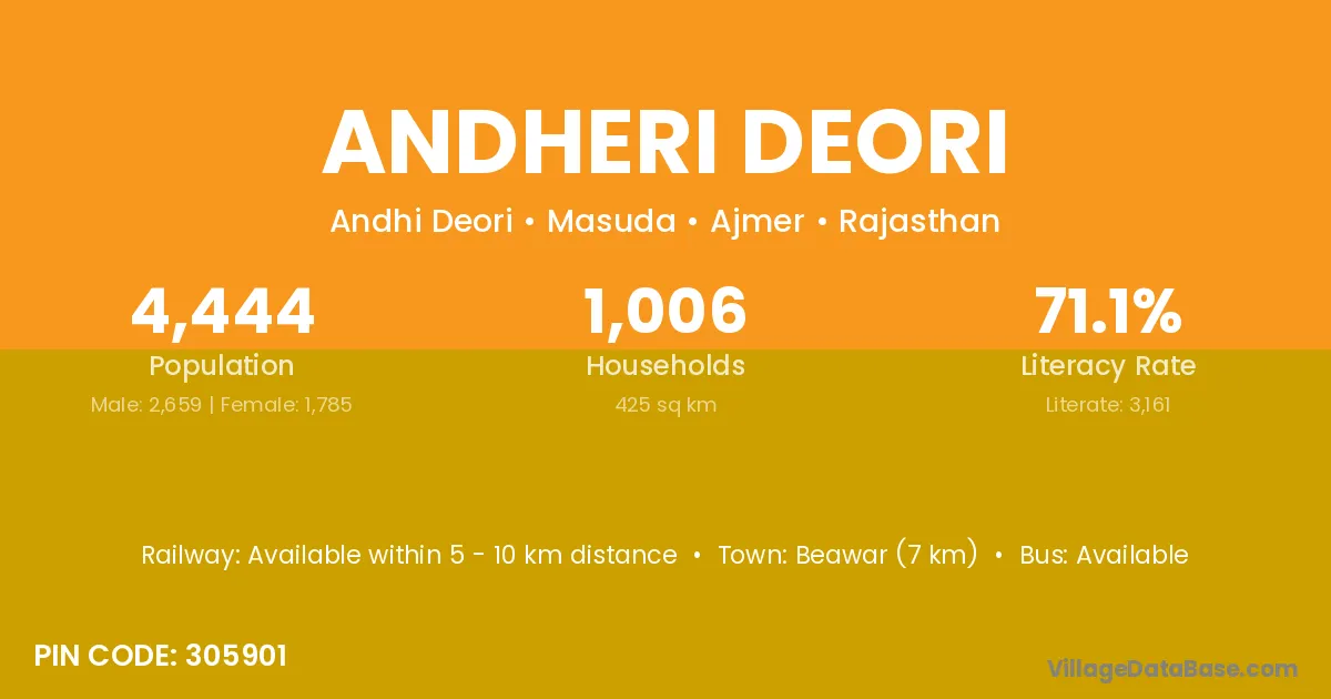Beawar (7 km) is the nearest town to Andheri Deori village for major economic activities and is located approximately 7 km away.