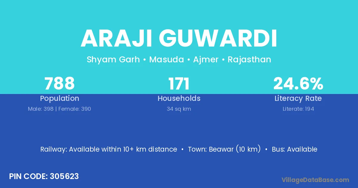 Beawar (10 km) is the nearest town to Araji Guwardi village for major economic activities and is located approximately 10 km away.