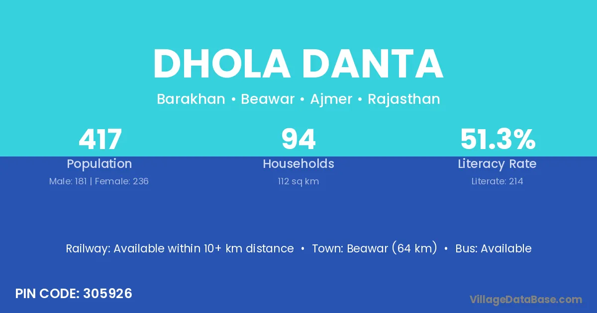 Beawar (30 km) is the nearest town to Dhola Danta village for major economic activities and is located approximately 30 km away.
