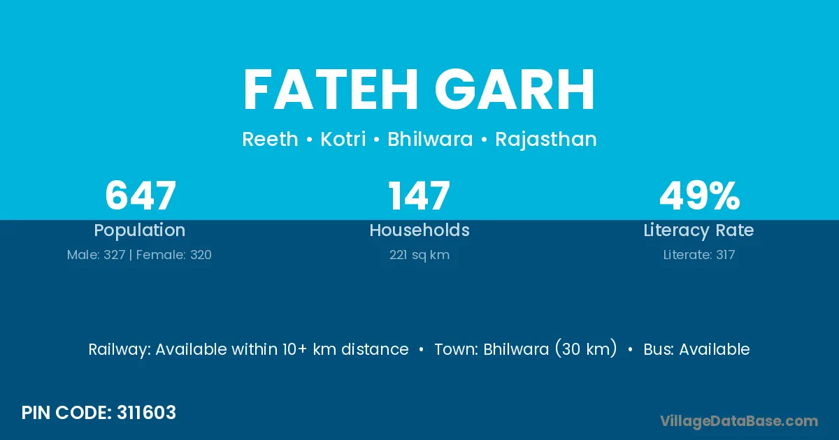 Vijainagar (21 km) is the nearest town to Fateh Garh village for major economic activities and is located approximately 21 km away.