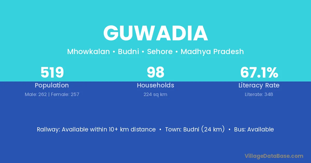 The literacy rate of Guwadia village is 38.50%. Male literacy stands at 53.77% and female literacy at 20.76%.
