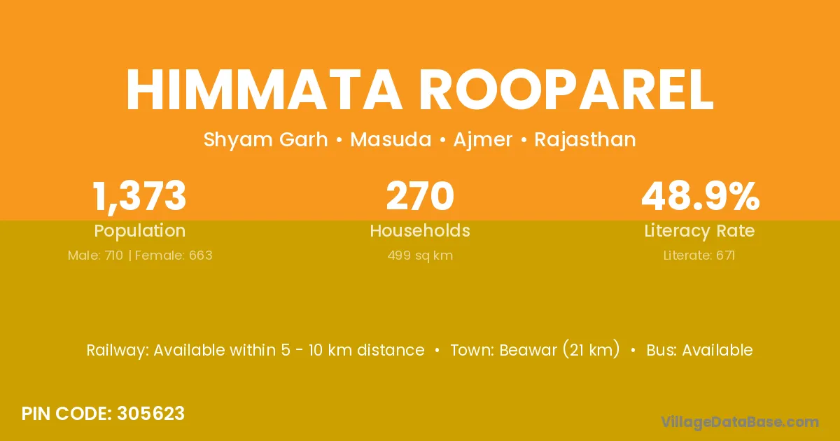 Beawar (21 km) is the nearest town to Himmata Rooparel village for major economic activities and is located approximately 21 km away.