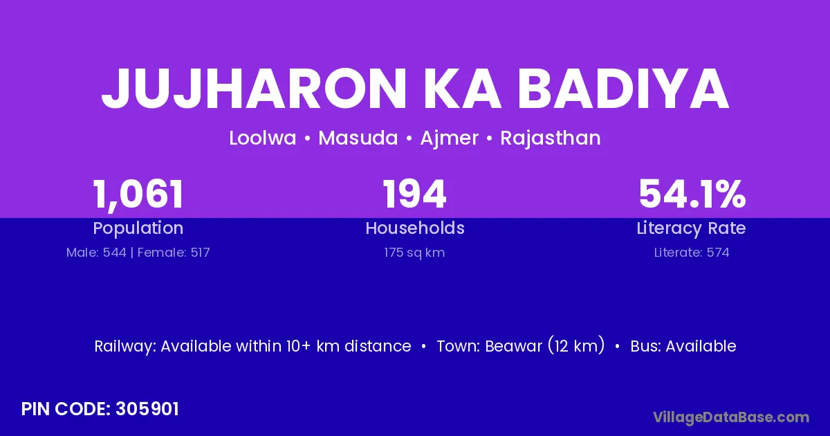 Beawar (12 km) is the nearest town to Jujharon Ka Badiya village for major economic activities and is located approximately 12 km away.