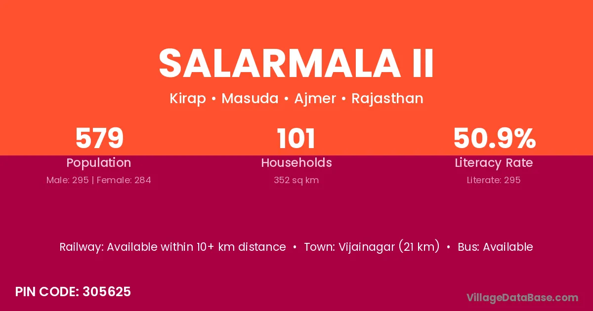 Vijainagar (21 km) is the nearest town to Salarmala Ii village for major economic activities and is located approximately 21 km away.