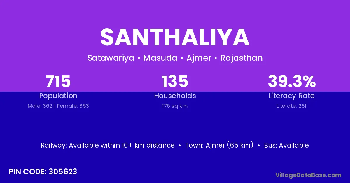Ajmer (65 km) is the nearest town to Santhaliya village for major economic activities and is located approximately 65 km away.