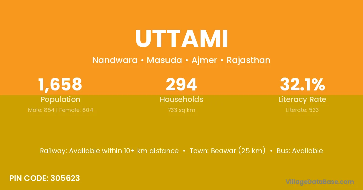 Beawar (25 km) is the nearest town to Uttami village for major economic activities and is located approximately 25 km away.