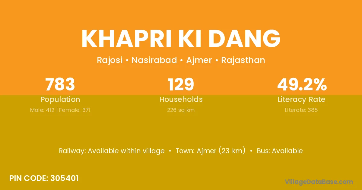 Ajmer (23 km) is the nearest town to Khapri Ki Dang village for major economic activities and is located approximately 23 km away.