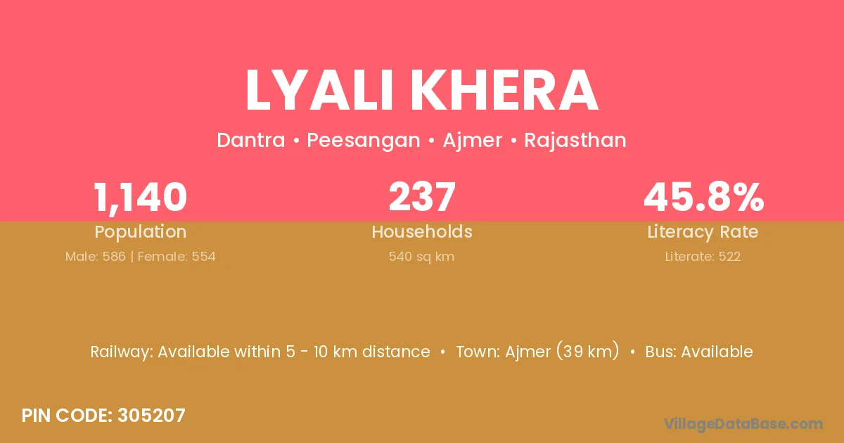 Ajmer (39 km) is the nearest town to Lyali Khera village for major economic activities and is located approximately 39 km away.