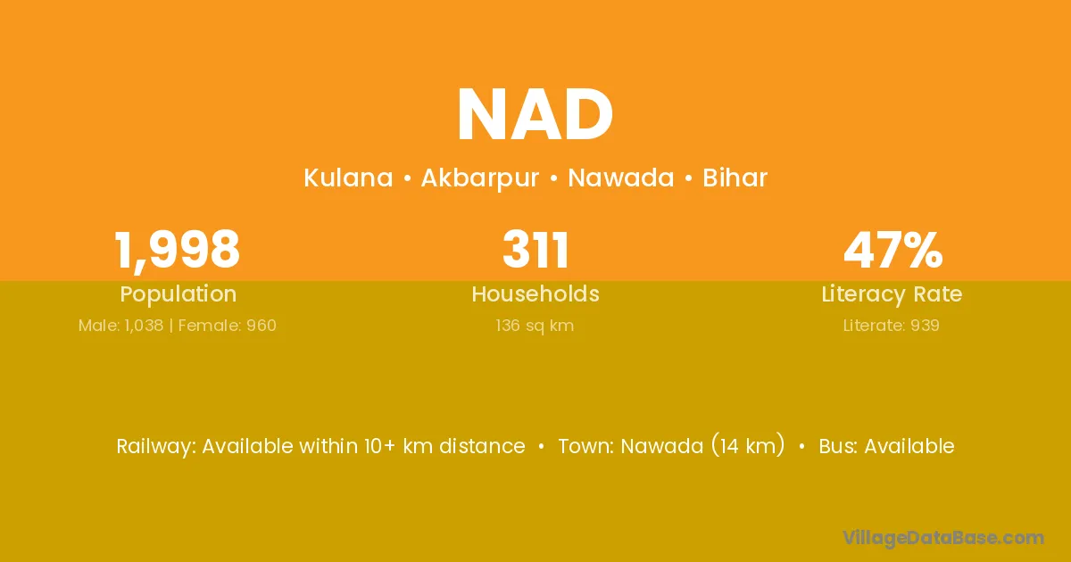 The literacy rate of Nad village is 47.60%. Male literacy stands at 66.02% and female literacy at 30.39%.