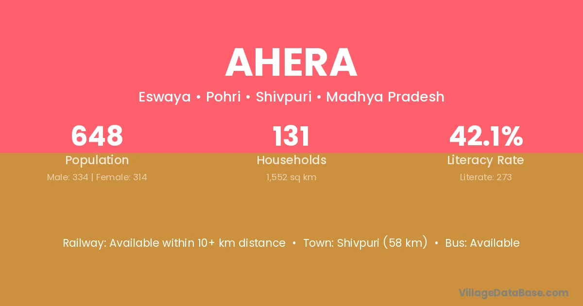 The literacy rate of Ahera village is 37.97%. Male literacy stands at 51.74% and female literacy at 21.82%.